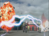 The Transtek Armor backs away as electricity bolts crash down around it and create explosions. |