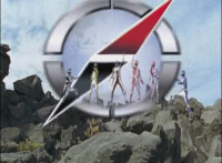 All six Rangers pose on a rock formation in front of their Overdrive Emblem. |