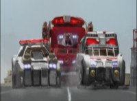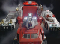 The Rescue Runners race into the city streets, before transforming into the Flash Point Megazord. |