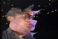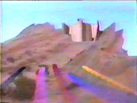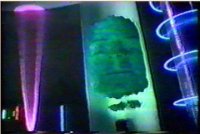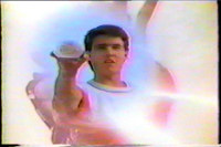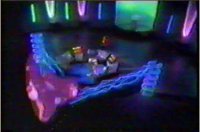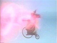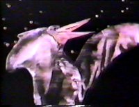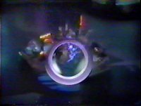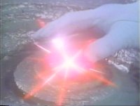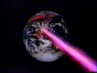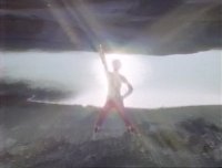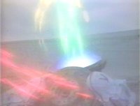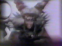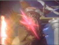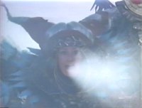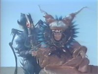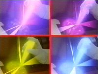 Split screen of Billy looking upwards at Zoltar/Blue readying Lance for Blaster. |
