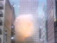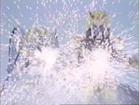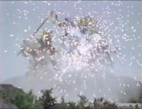 Flyguy gets scared; MegaDroid slashes sword; Flyguy is hit & explodes massively. |