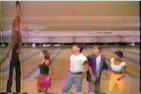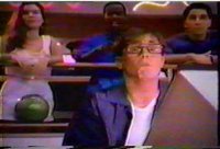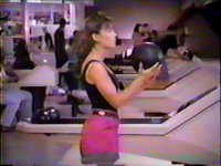 Split screen of Kim holding bowling ball/Pink flinging bow in Power Blaster assembly. |