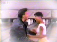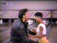Split screen of Trini preparing to bowl/Yellow twirls Daggers in Blaster assembly. |