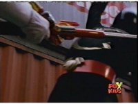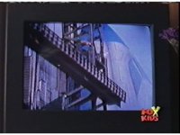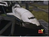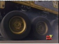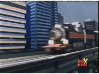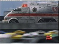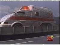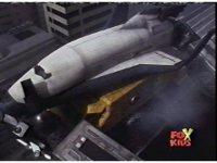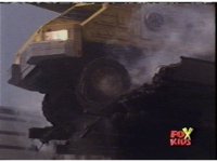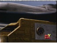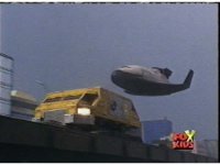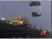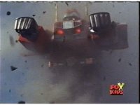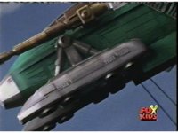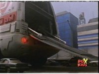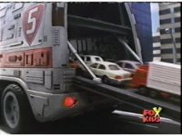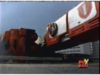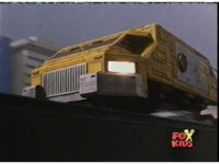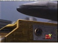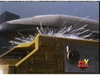 The shuttle begins to slide off of Haz Rescue, Red touching ear and talking anxiously, Yellow responds, then the shuttle sparks against the top of the Zord again, the tires wobbling. |