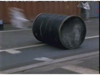 The wind gusts cause a barrel to do a barrel roll. |