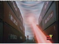 The Rangers enter the breezy alley between shipping containers, Red raises a fist, and scans the tornado ahead with his visor, pinpointing the monster within, which he nod-talks about while braving the gusts. |