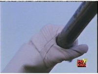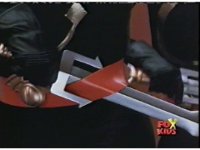 Cuts before zoom in. Cuts follow-up shot of LM posing with sword, then another Red shot. |