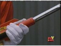 Springing out from the insignia on the belt area, the Lightspeed Megazord's Saber forms as lightning crackles about. |