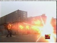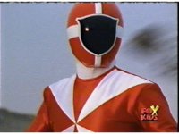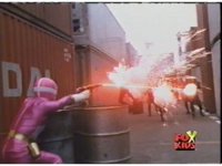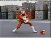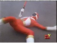 Whirlin' grabs Red and slams him into some stacked cans and boxes, then tosses him aside, where he recovers with his Baton, and awaits the monster's next move, before rushing forth, only to get blasted down by Whirlin's energy flames. |