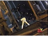 Yellow beats down one Batling, but is surrounded, so she scales up a rope, and from above, fires her Rescue Blaster down upon the crowd sparkily. |
