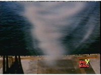 While on the ground, the Rangers whip out their Rescue Blasters and fire upon Whirlin', spark bursting him. He talks, then begins to spin, turning back into the tornado. |