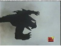 Pan up from the smoking monster debris, to Jinxer atop a nearby tower. |