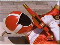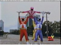Each of the other four Rangers grabs one of Pink's limbs, and lifts her up in the air, then pitches her forth, where she pulls out her Rescue Blaster and fires sparkily at Gold Beaked Monster. |