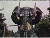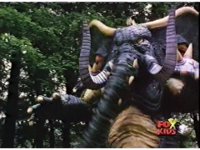 Elestomp talks, pats his belly, then stomps down each foot, before impaling his trunk into the ground, and snorts fire breath underground, which burrows forth and erupts under the Rangers, knocking them down. |
