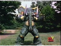 Elestomp scrapes his foot against the ground like a bull, then charges forth, missing each Ranger but finally slamming into Green, bashing him into a tree and flipping him over, where his teammates regroup around him. |