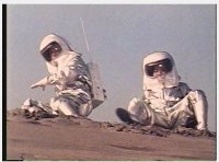 Astronauts walk on surface of Planetoid, with shuttle, Earth & Moon behind them. |