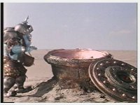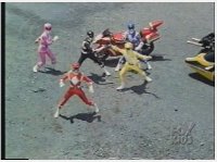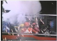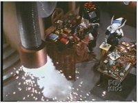 Cockpit shakes, Rangers rattled, except Red Ranger who recovers quick to grab controls. |