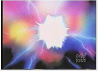 Dumpster top is pulled off, and colored streaks land on horizon becoming the ESAs with lightning. |