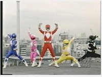 Male Rangers raise fists in triumph, while Yellow grabs Blue's arm and Pink looks sharply to our right. |