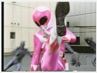 Pink & Black Rangers give thumbs up to their leader then grip their controls with both hands as the camera shakes to imply driving . |
