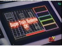 In the Supertrain dash monitor, schematics of the Rail Rescues flash with "Super Train Systems OK" on top. |