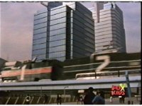 Supertrain races down the tracks in the city. |