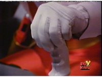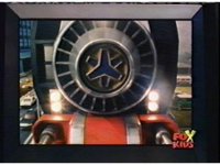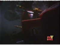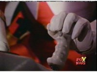 Supertrain Megazord's turbine fist charges up, glowing and crackling with electricity. Which also crackles in the cockpit, frying the Rangers. |