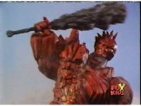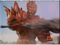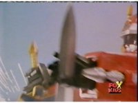 Magmavore turns and clubs Lightspeed Megazord's Saber in half sparkily. |