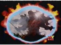 On the flamey viewing portal, Magmavore & Trifire begin to lower into the ground. |