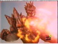 Magmavore turns and walks over to a big pile of debris, which he fires eyebeams at, causing the debris to swirl about with energy, forming into the revived and upgraded Trifire. |