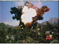 Struck by missiles, Trifire bursts, then drops his weapon and expands before exploding from the inside out. |