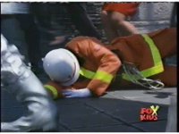 Dark-haired citizens get debris rained down upon them, one rescue worker falling down as everyone races away. |