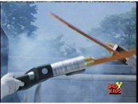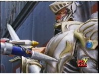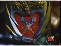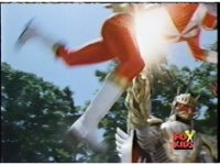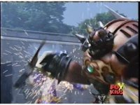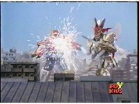 Lightspeed Megazord gets its Saber caught between Demonite's sword-arms, before he then uses one of them sparkily on its right shoulder, spark bursting Red's cockpit. |