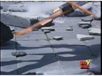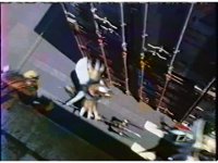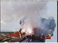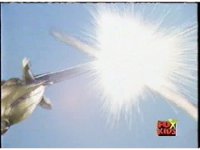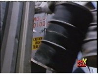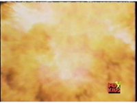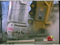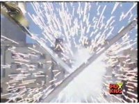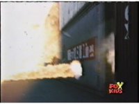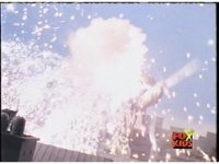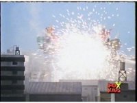 Close on upper roof area of building, as the antenna at the top spark bursts, quickly causing the rooftop structure below it to explode into debris. |