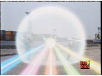 The Rangers aim their V-Lancers forth and fire them at the Demon trio, the Spectra Blast hitting their forcefield dome and returning to them explosively. |