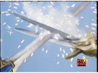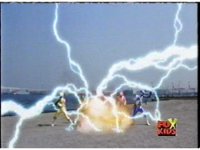 Pink & Blue attempt to use V-Lancers on Thunderon, who sparkily punches them about. |
