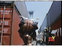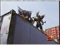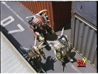 The Demons glance about, Thunderon talking, as they slowly press on, initially unaware the Rangers are lurking above the containers, until Demonite stops and eyebeam blasts four of them down from above. |