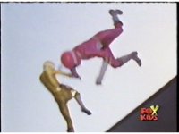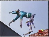 Green & Yellow strike their V-Lancers at Falkar, who ducks under and hops over their blades, then kicks both away. |