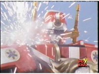 In a fiery dimension, Lightspeed Megazord slashes through a flaming corona, three times total. |