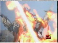 Demonite spark bursts until he falls and rolls away, getting back up, and seeing Supertrain Megazord towering over it, Lightspeed Megazord, and the partially-fiery city. |
