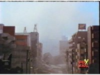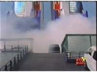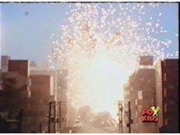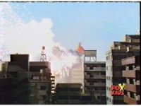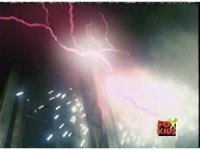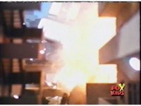 Energy balls strike mirrored-windowed building, which erupts explosively from within, all sides at once spewing forth dust and debris. |