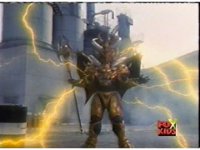 In a crackle of golden electricity, Diabolico teleports in, talking and pointing his staff forth, the Rangers get up, Red responds to him, he then speaks back. |