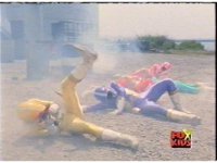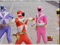 Troika falls, rolls, gets back up, only to get Battle Booster-punched and chopped by the Rangers, until he falls again. |