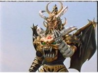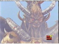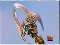 Diabolico raises his staff over the downed Supertrain Megazord and is about to strike it, when it reaches up and blocks the staff, to which he then speaks. |