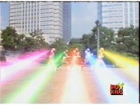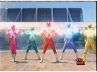 All five Rangers raise their V-Lancers in Blaster Mode to the sky and fire energy beams into one concentrated point, a Spectra Blast, which flashes with a V. They then lower the Spectra Blast, which flies away from them, flashing a V. |