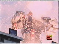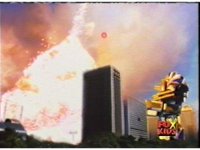 With a huge gaping hole in its chest, Supertrain Megazord bursts, collapses, and explodes. |