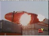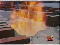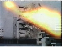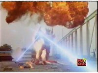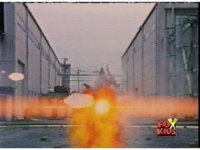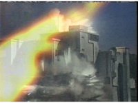 An energy blast makes an apartment building explodes. I dunno, it just looks like an apartment to me. |
