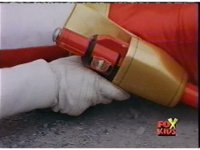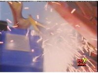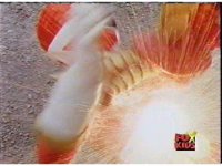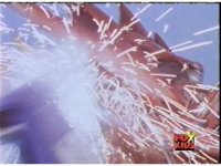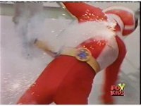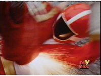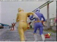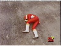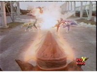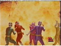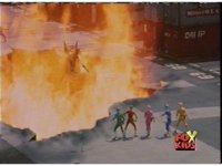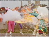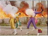 Cuts follow-ups of Blue bursting, then the Rangers falling down and writhing. |