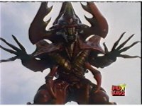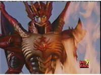 The Rangers (except for Pink) fire Rescue Blasters upon Impus' cocoon, causing it to fire burst, before exploding massively, sending a wall of flames flying at the Rangers, as the explosion leaves a flaming crater below it. The Rangers gaze into the flaming hole, from where, shrouded in darkness, Olympius ascends. |