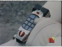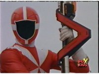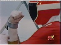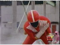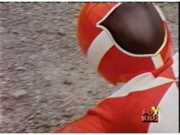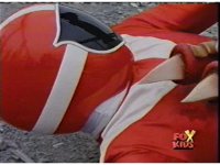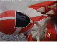 Red looks up, whips out his Rescue Blaster and aims it at Olympius, who grabs it, talks down to him, then snatches it from his grasp, as Red gets up, then gets kicked away, rolling back up, clutching his shoulder. Olympius points the Blaster forth, and fires at Red, bursting him down beside his teammates, before tossing the Blaster aside as shot pushes in on him gloating. |